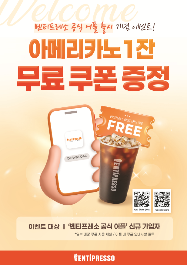 "벤티프레소 오더 신규가입 시 아메리카노 1잔 무료 쿠폰 증정!"